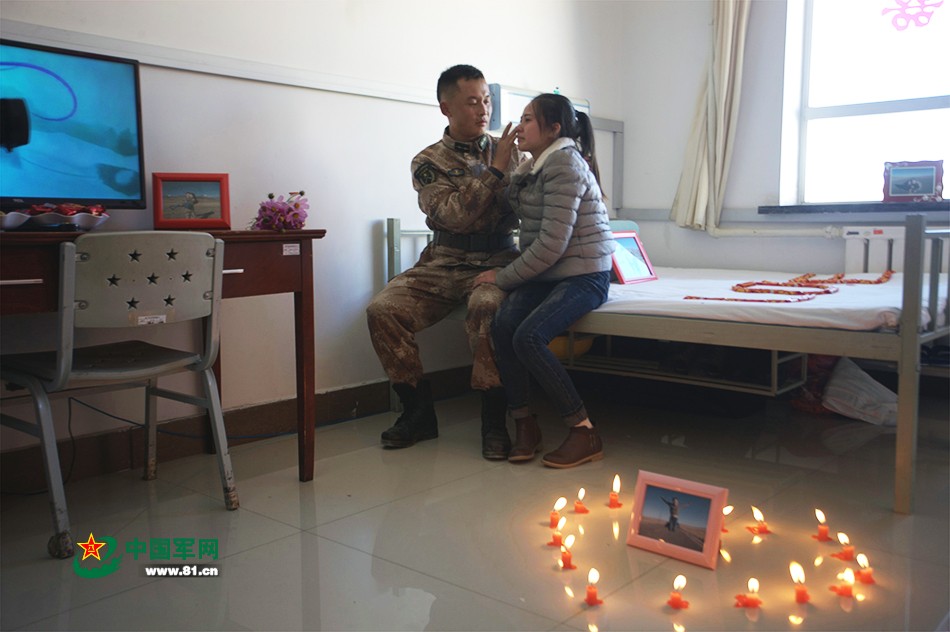 “我以士兵的名义起誓,让身上的军装见证,让我陪你走完一辈子。亲爱的,嫁给我吧!”塞北雪虐风饕,素有“西北第一哨”之称的白哈巴边防连连队内却热闹非凡。白哈巴边防连地处新疆阿勒泰地区,官兵离家遥远,通信技师束方平只能通过视频向远在江苏的未婚妻真情表白。(杨子周摄影报道)