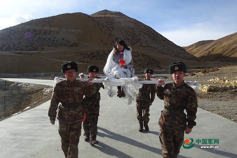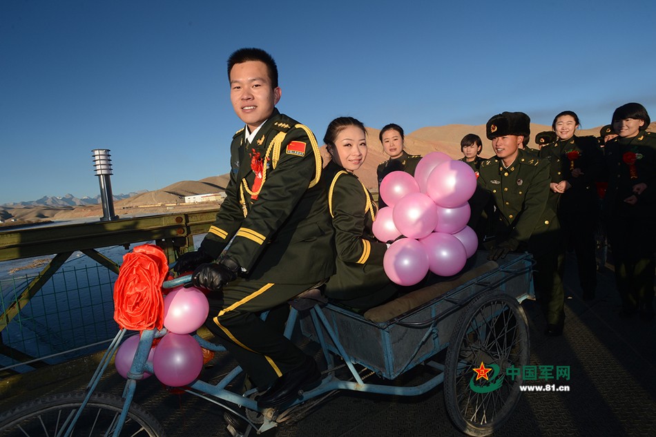 西藏阿里边防高寒偏远、条件艰苦,官兵的婚恋一直是大难题。2014年12月11日,一对相恋4年的边防军人结成眷属。虽然驻地落后偏远,婚礼所用物品奇缺,但新郎骑上连队的“豪华”三轮车将一身戎装的新娘迎娶回自己的单身宿舍,二人伴着战友的祝福声在海拔4300米的阿里首府狮泉河镇牵手结为夫妻,共同戍边。(向文军摄影报道)