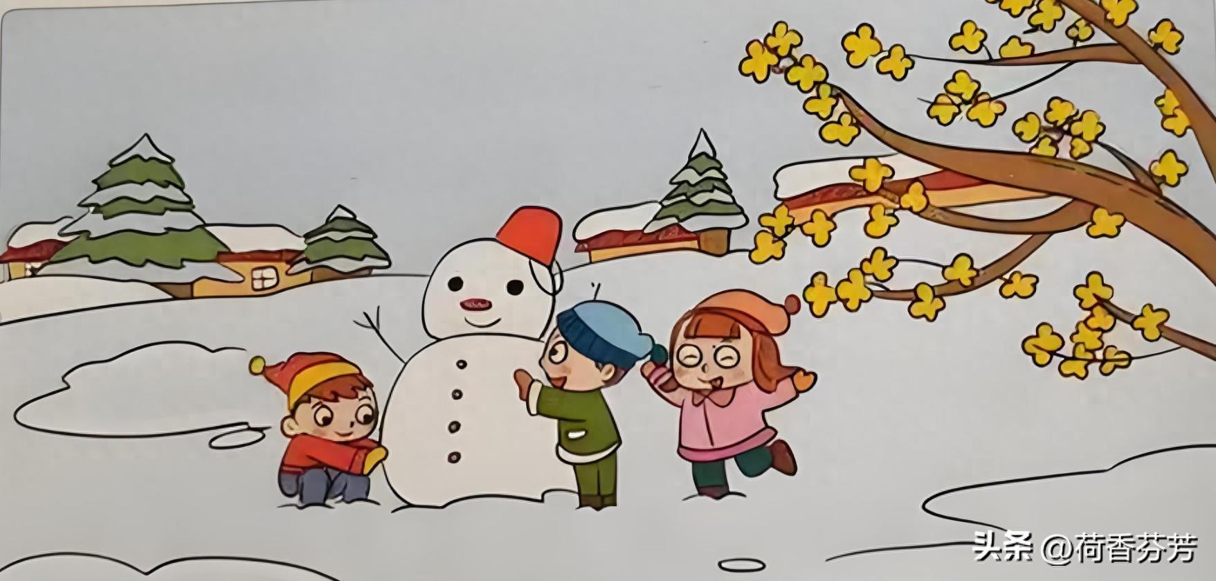小明用石头做雪人的眼睛,辣椒做嘴巴,胡萝卜做鼻子,小军找来两根树枝做雪人的手臂,加上一个胖乎乎的身子,雪人就做好了。小雪高兴地跳起来说:“雪人镇可爱!”几支腊梅花也凌寒开芳,淡黄色的花瓣散发着香味。漂亮极了!