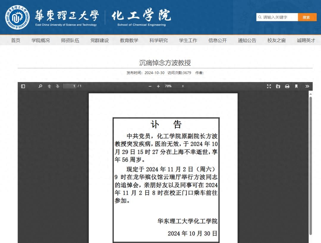 华东理工大学化工学院原副院长方波教授,因突发疾病,医治无效,于2024年10月29日15时27分在上海不幸逝世,终年56周岁。