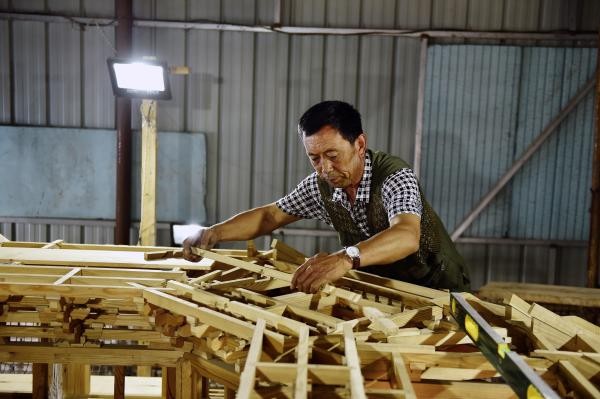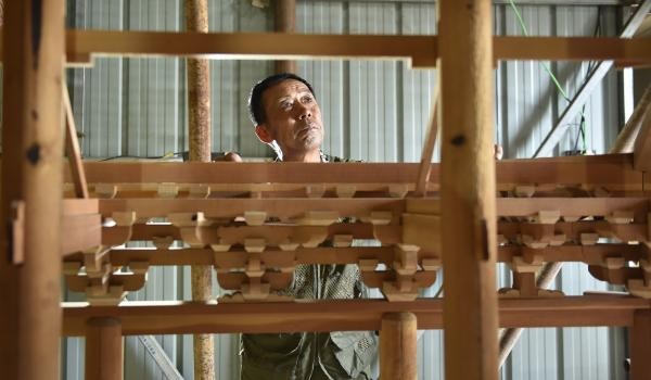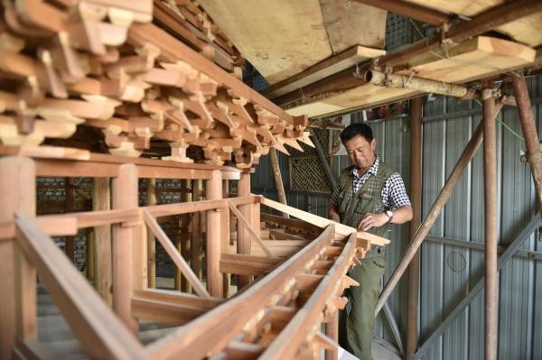 ↑6月18日,应县农民赵玉山在建造微缩版应县木塔。