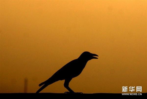10月7日,在巴基斯坦西北部城市白沙瓦,一只乌鸦停在落日余晖中。 新华社发(赛义德·艾哈迈德摄)