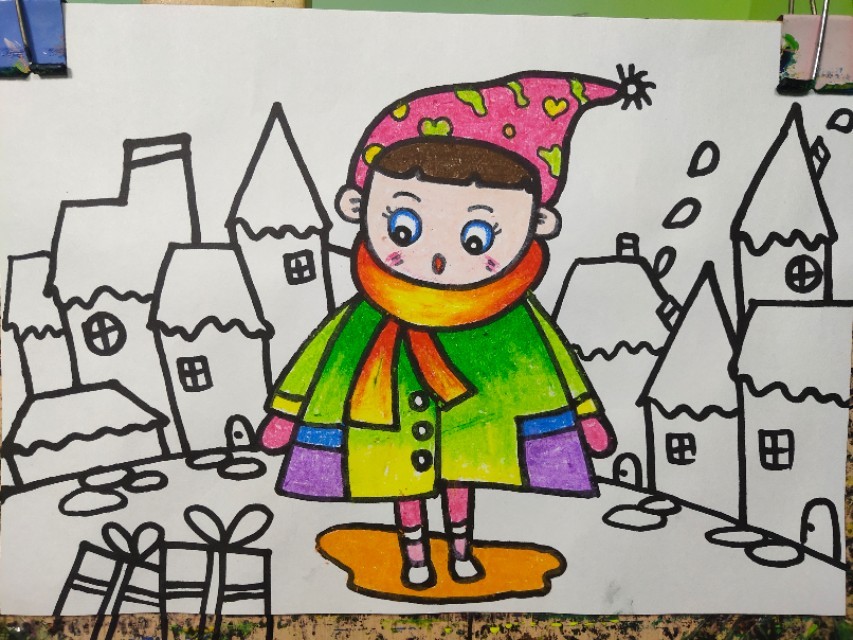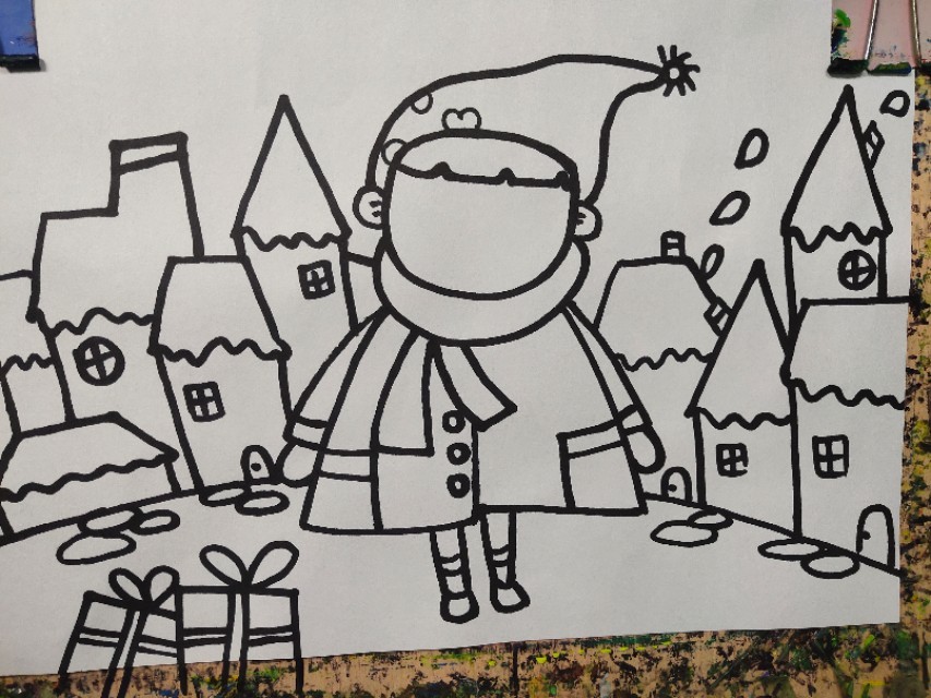 材料:勾线笔,油画棒,水粉颜料(蓝色)水粉笔,素描纸