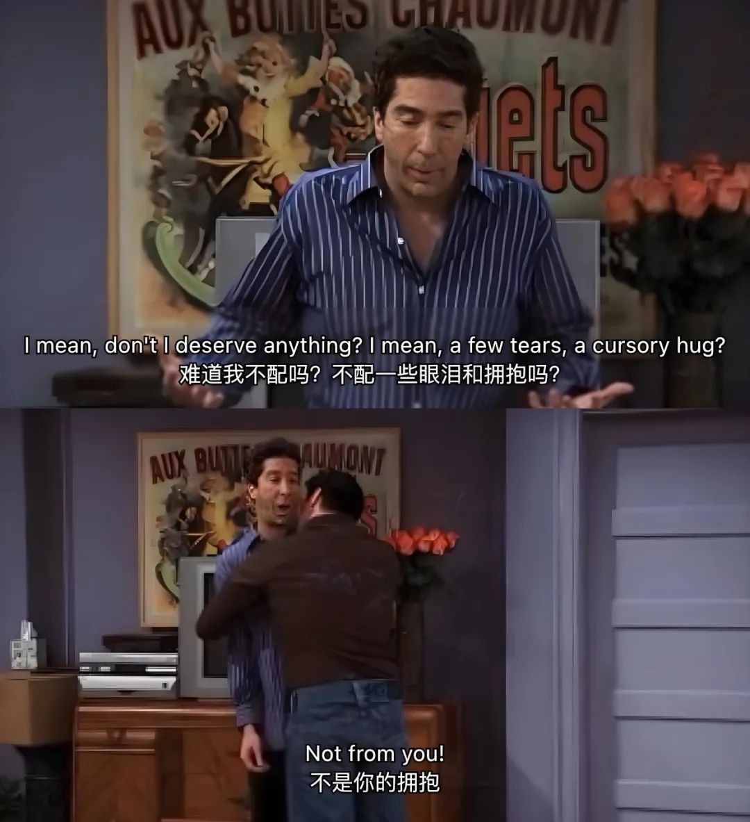 △在Friends中,Ross抱怨女友Rachel没有单独跟他告别,Joey马上给他来了个cursory hug,Ross又气又好笑。这一幕你还记得吗?