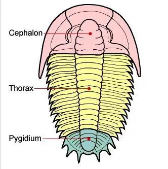 从背部看三叶虫(trilobites)为卵形或椭圆形, 成虫的长为3~10厘米,宽为1~3厘米。小型的6毫米以下 。从结构上可分为头甲、胸甲和尾甲三部分。三叶虫体外包有一层外壳,坚硬的外壳为背壳及其向腹面延伸的腹部边缘 。腹面的节肢为几丁质,其他部分都被柔软的薄膜所掩盖。一般所采到的三叶虫化石都是背壳。三叶虫背壳的中间部分称为轴部或中轴,左、右两侧称为肋叶或肋部。三叶虫壳面光滑。或有陷孔、瘤包、斑点、放射形线纹、同心圆线纹、短刺等。头部多数被两条背沟纵分为三叶,中间隆起的部分为头鞍及颈环,两侧为颊部,眼位于颊部。颊部为面线所穿过,两面线之间的内侧部分统称为头盖,两侧部分称为活动颊或自由颊。胸部由若干胸节组成 ,形状不一,成虫2~40节 。中间部分为中轴,两侧称为肋部。每个肋节上具肋沟,两肋节间为间肋沟。尾部是由若干体节互相融合而形成的 ,1~30节以上不等。形状一般半圆形,但变化很大,可分为一中轴和两肋部。肋部分节,有肋沟和间肋沟。肋部可具边缘 ,边缘上亦常有边缘刺。