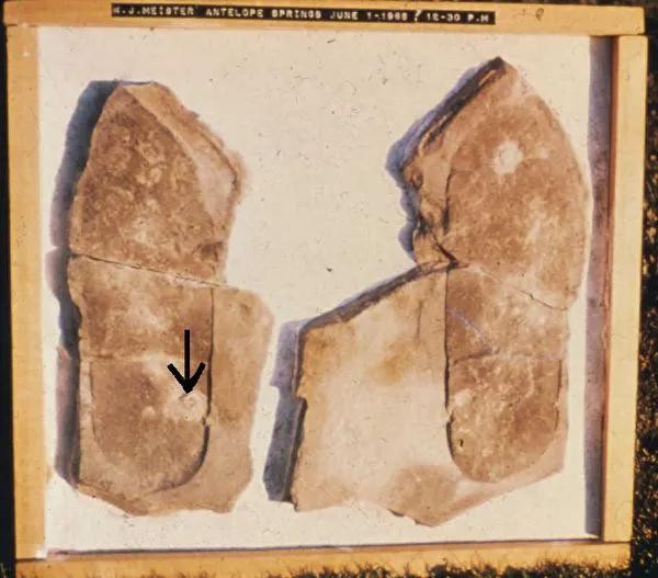 1968年,三叶虫脚印化石在美国被迈斯特(William J. Meister)发现。这只鞋印长26厘米、宽9厘米,正好是成年男子鞋的常见尺码,即欧码41号(3.5英寸宽,10.25英寸长)。1968年6月13日,报纸《Deseret News》发表了题目为“Puzzling Fossils Unearthed”(令人困惑的化石)的文章,报导了该足迹化石的发现。文章附带了化石照片,随后该发现在全美国各地报纸进行了报导。