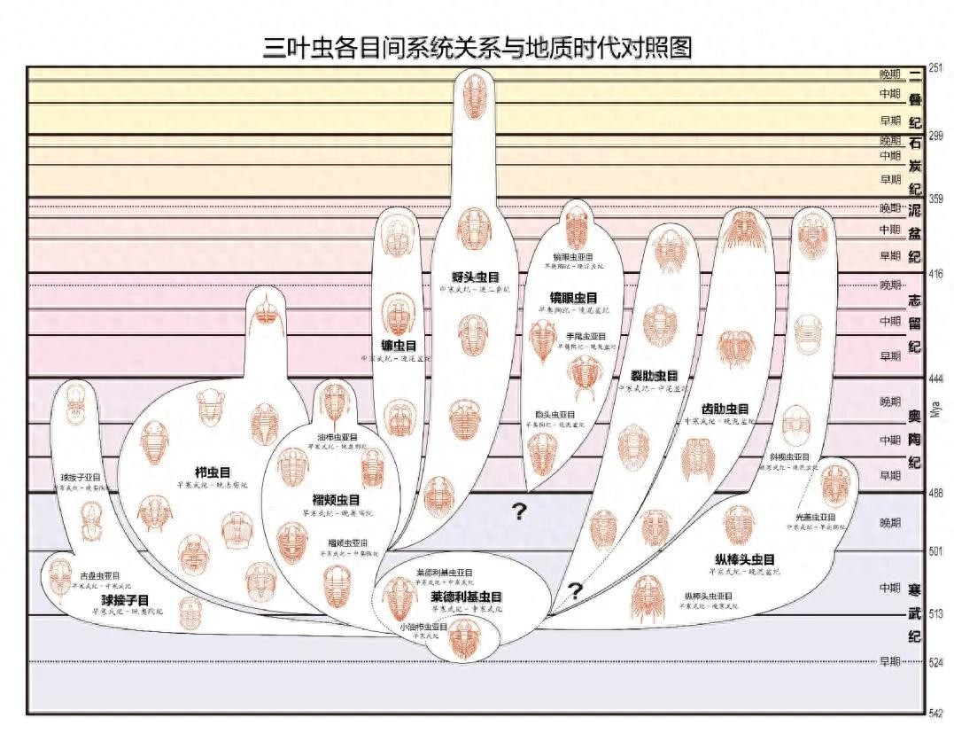 在动物分类学上,三叶虫属于节肢动物门、三叶虫纲。它们生活在远古的海洋中,主要出现在寒武纪,到寒武纪晚期时发展到顶点。此后,三叶虫从极盛的高峰走向衰退,延续到二叠纪末期时绝灭,没有进入中生代。三叶虫在整个古生代3亿多年的漫长地质历程中生生不息,繁衍出了众多的类群和巨大的数量,三叶虫纲可以分为10目 :球接子目、莱得利基虫目、耸棒头虫目、褶颊虫目、镜眼虫目、裂肋虫目、栉虫目、镰虫目、砑头虫目及齿肋虫目。总计有1500多个属,1万多个种,其中发现于我国的有大约500个属。