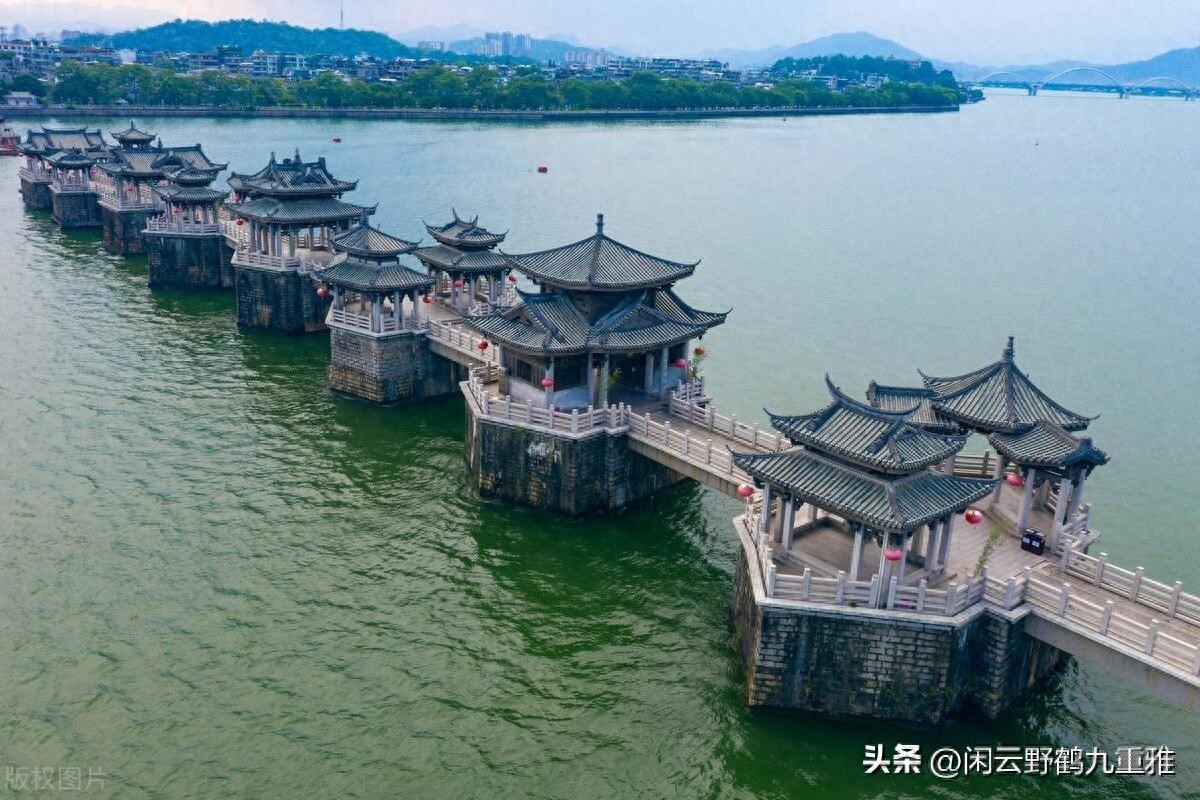 在广东潮州,韩江之上横卧着一座充满传奇色彩的古桥 —— 广济桥。它宛如一条巨龙,横跨在宽阔的韩江两岸,将潮州古城的东西两岸紧密相连。这座桥全长 518 米,由东西两段石梁桥和中间一段浮桥巧妙组合而成 ,远远望去,24 座形态各异的亭台楼阁点缀在石梁桥上,高低错落,古朴而典雅;中间由十八只梭船横向并排,用铁索连接而成的浮桥,似长虹卧波,贴着韩江江面随潮水涨落,与坚固的石梁桥相互映衬,构成了一幅独特而迷人的画面。