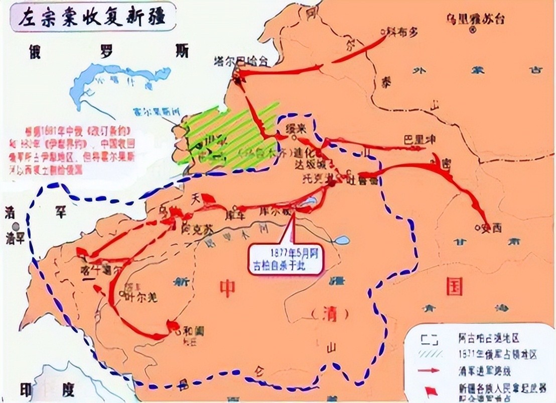 1851年洪秀全、杨秀清等人在广西金田村发动反清武装起义。1852年皖、鲁、豫一带爆发捻军起义。1856年英、法联军发动侵略中国的第二次鸦片战争。1862年陕甘地区爆发的回民“起义”几乎使整个陕西、甘肃都脱离了清王朝的控制......1863年陕甘地区的回民暴动波及到新疆。这时浩罕汗国多年前在中国新疆埋下的雷终于要爆了。1865年浩罕汗国的阿古柏趁清王朝内忧外患之时侵入新疆,再后来左宗棠驱逐阿古柏侵略军收复新疆的故事就是大家比较熟悉的了。