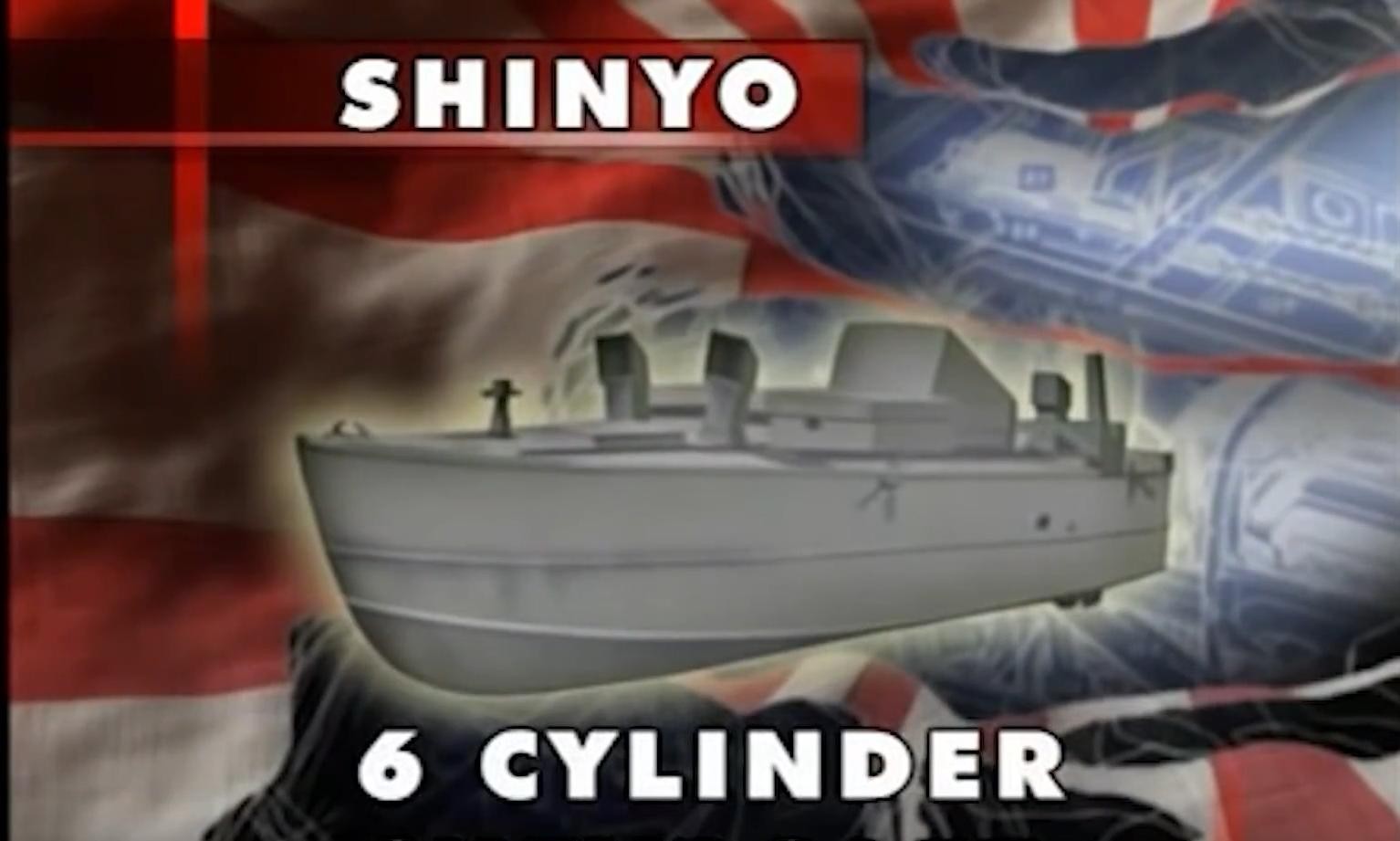震洋特攻摩托艇,又称海上轻骑敢死队特攻,艇长 5 米左右,宽约 1.2 米,最大速度 25 节,成员一人,艇内安装 250 公斤高爆炸药,艇首安装撞击起爆的引线,简单来说就是装载了烈性炸药的小型摩托艇。