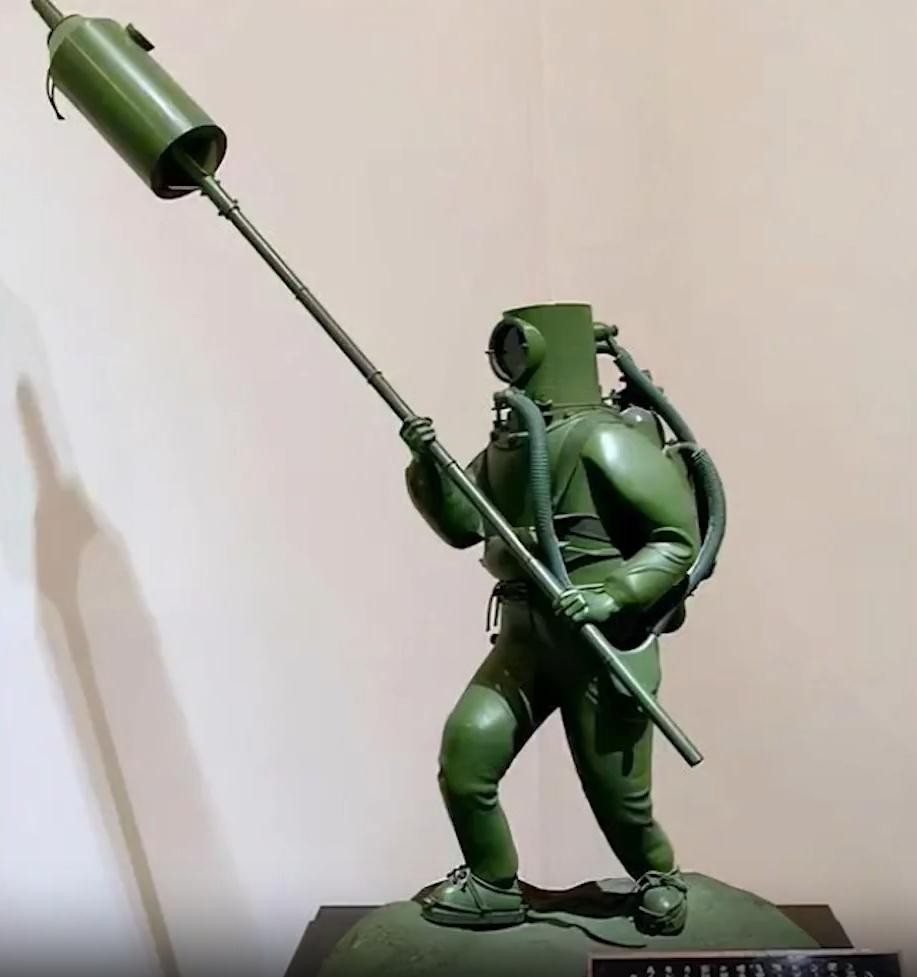 伏龙特攻潜水员这种攻击手段则更为特殊,是将一枚水雷固定在一根 5 米长的竹竿上,当美军舰艇登陆时,由一名潜水员手持竹竿埋伏于海底,用竹竿把水雷放置到美军舰停底部。