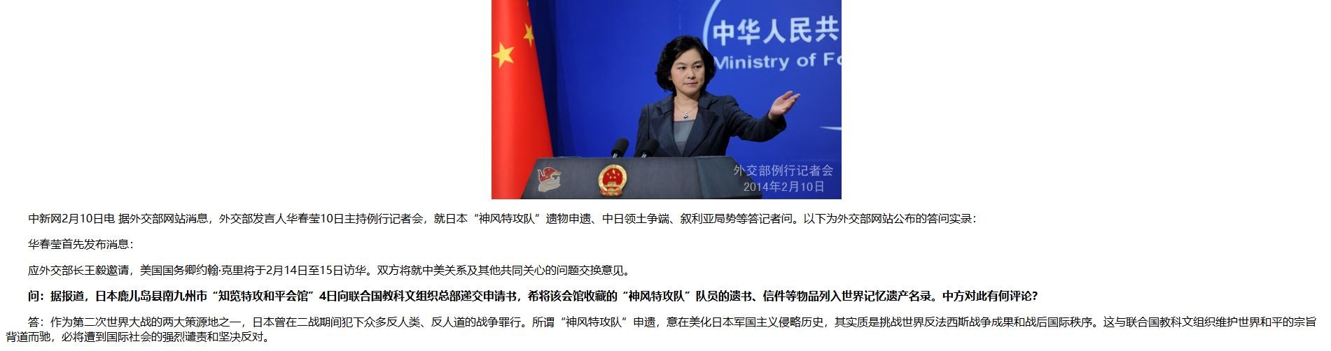 中国外交部发言人华春莹曾表示,所谓 “神风特攻队” 申遗,意在美化日本军国主义侵略历史,其实质是挑战世界反法西斯战争成果和战后国际秩序,这与联合国教科文组织维护世界和平的宗旨背道而驰,必将遭到国际社会的强烈谴责和坚决反对。