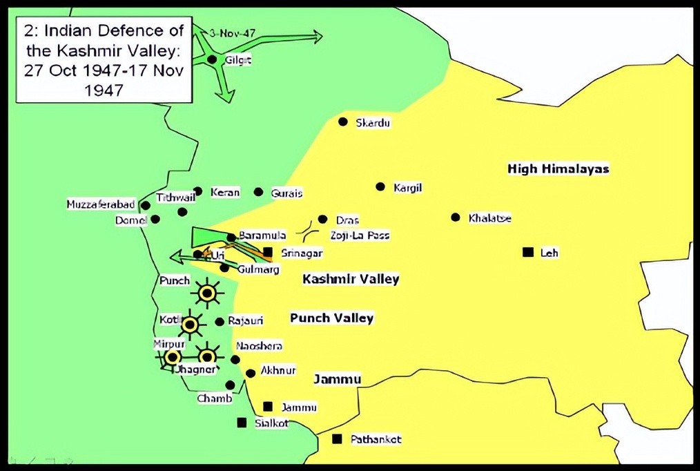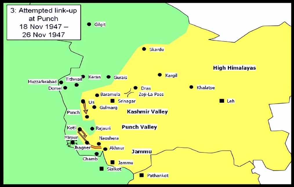 面对如此不利的局势,真腊再也坐不住了,他不顾英国劝阻,决定派出正规军队参战,至此,印巴全面战争爆发,同月,巴军正规军4万多人进入克什米尔,首要目标是久攻不下的朋区(punch),在开战之初,巴民兵即发动对朋区的围攻,但朋区建在海拔3000米的高地上,易守难攻,巴民兵数次攻打,均未能得逞。印军前来支援,但也未能解围,双方僵持,此时,巴正规军来到,再次发动对朋区的攻打,印度方面亦投入增援,进行作战,双方你来我往,反复争夺,在朋区陷入僵持。同时,在斯利那加以西的巴坦城,巴基斯坦民军则抓住印军步坦协同上的缺陷,先放坦克进城,再集中火力打击后续跟进步兵,取得极好效果,使得印军迟迟不能占领该城。最终印军决定先用火炮轰城,然后步坦一同出击,进占一地后由步兵固守,如此循环前进。在这种打击下,巴基斯坦民军无法继续支持,放弃巴坦,进而印军长驱直入,控制了克什米尔西南部及西部地区。