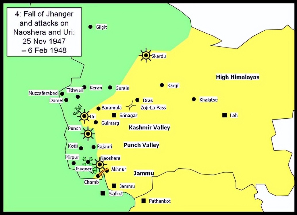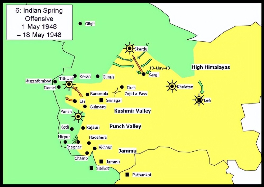 到了1948年3月,冬季过去,战争再次爆发,到1948年3月17日,印军率先在查谟地区发起攻击,直指巴基斯坦民军最前沿:唐格尔(Jhanger)。印军第7坦克旅又一次显示出新式武器在现代战争中的决定性作用,印军以坦克为先驱进行攻击,手中只有轻武器的巴基斯坦民军根本无法抵挡,次日唐格尔就被印军攻克。随后,印军前往解围拉乔里(rajauri),拉乔里是查谟地区的重镇,濒临德维河,是克什米尔通往查谟地区的要道,已被巴民兵围困数月,巴军牢牢控制拉乔里南部的交通要道——班瓦里大桥,封锁城市,严阵以待,印军见难以突破,再次祭起“夜袭”的法宝,他们一边正面对巴民兵阵地不断发动佯攻,一面决定冒险以坦克进行夜袭,4月8日夜,印军以十几辆坦克为先导,步兵紧随其后,乘巴军熟睡之际,以低速静默方式泅渡河流,(这一举动十分危险,因为坦克在河中很容易搁浅)突然出现于巴军阵前,随后发起攻击,围城巴军猝不及防,大败,丢下拉乔里逃走,印军解围。其前锋甚至已逼近巴基斯坦本土边境。