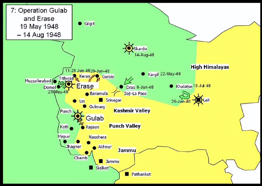 在克什米尔北部,激烈的战争仍在如火如荼地进行。在克什米尔北部,巴基斯坦民兵得到了吉尔吉特(即唐朝时期的“小勃律”)和奇特拉尔的支援,站稳了脚跟,到了1948年5月,克什米尔北部的巴基斯坦部队开始南下,向克什米尔腹地发起进攻,他们首先攻占了卡吉尔(kargil),随后兵分两路,向东西两个方向攻击前进。在东部,巴基斯坦民军占领了哈拉策后继续东进,于7月2日进抵克什米尔东部的战略城市列城(leh)城下,试图攻下列城,如此能把控制力延伸到克什米尔西部的整个拉达克地区。在西部,民军攻占了离卡吉尔49公里的德腊斯(Dras),前出至离斯利那加不足199公里的乍吉山口(zoji-la pass)。印军固守列城、乍吉山口,与巴基斯坦民军展开了激战。(见地图).乍吉山口是喜马拉雅山脉的一处隘口,也是喜马拉雅山脉的最低点,地势险要,只有一条羊肠小道。一夫当关万夫莫开,也列城通往斯利那加的必经之路。如乍吉山口沦陷,巴军则可长驱直入,直捣斯利那加,后果不堪设想。但巴军推进迅速,此地守军薄弱,无法抵挡,7月7日,乍吉山口被巴军攻占。残存印度守军撤退,与主力部队会合,企图乘巴军立足未稳,夺回乍吉山口。