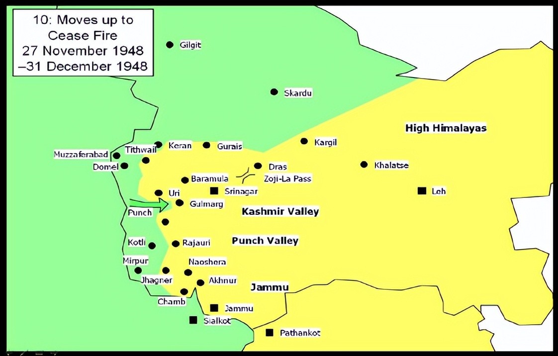 至1948年年底,尽管印军在战场上取得优势,但冬季来临,大雪封山,不利于印度军队行动,印度本土距离克什米尔较远,且多为山地,补给不便,反观巴基斯坦距克什米尔近在咫尺,且多为平原,可以源源不断获得补给,如果演变为长期战争,势必对印度不利,因此,印度决定见好就收,表示原意接受联合国调停。1949年1月1日,双方停火。此后,开始了长达半年的谈判,在联合国调停下, 7月17日,双方草拟和约,印度占据了克什米尔全境五分之三的地区,人口约400万。巴基斯坦只控制五分之二的地区,人口约100万。按照和约,克什米尔独立已不可能,双方应同时撤兵,而后通过全民公投决定克什米尔的归属,但印巴双方不约而同拒绝撤兵,致使和约最终成为一纸空文。时至今日,克什米尔的归属问题仍然是印巴双方的“死结”,成为南亚的“火药桶”