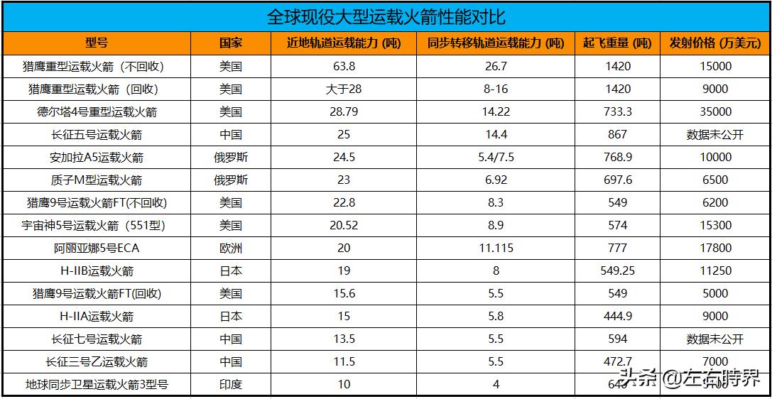 全球现役大型运载火箭性能排序(以近地轨道运载能力排序)