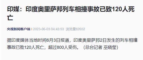 据央视新闻援引印度媒体当地时间 6 月 3 日报道,印度奥里萨邦 2 日发生的列车相撞事故已致 120 人死亡,超过 800 人受伤。