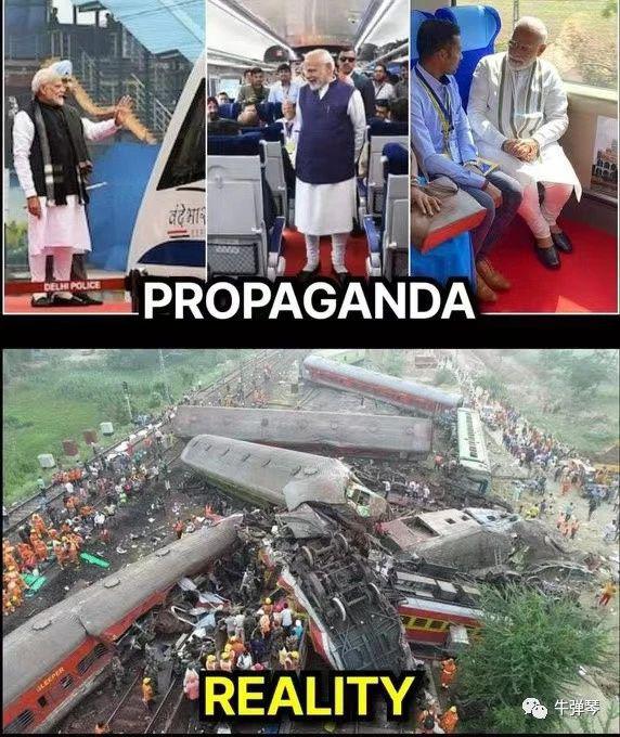 还有人贴出一张对比图,上面是莫迪在印度列车里谈笑风生的图片,一个词" 宣传 "(PROPAGANDA);下面是这次印度火车事故的惨烈现场图,一个词" 现实 " ( REALITY ) !