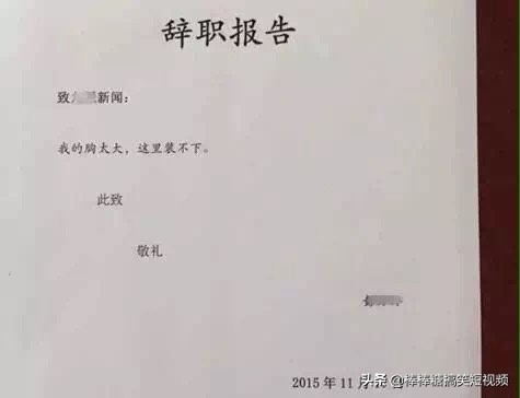 11月18日,九派新闻一名记者的辞职报告“意外”走红,其简洁封面除了必要内容如时间和抬头外,就一句:“我的胸太大,这里装不下”,可谓相当有逼格。很快,这张照片就在媒体圈刷屏。很多人预测,这张照片必火,甚至段子都出来了。老板回复:再大也逃不过我的手掌心!