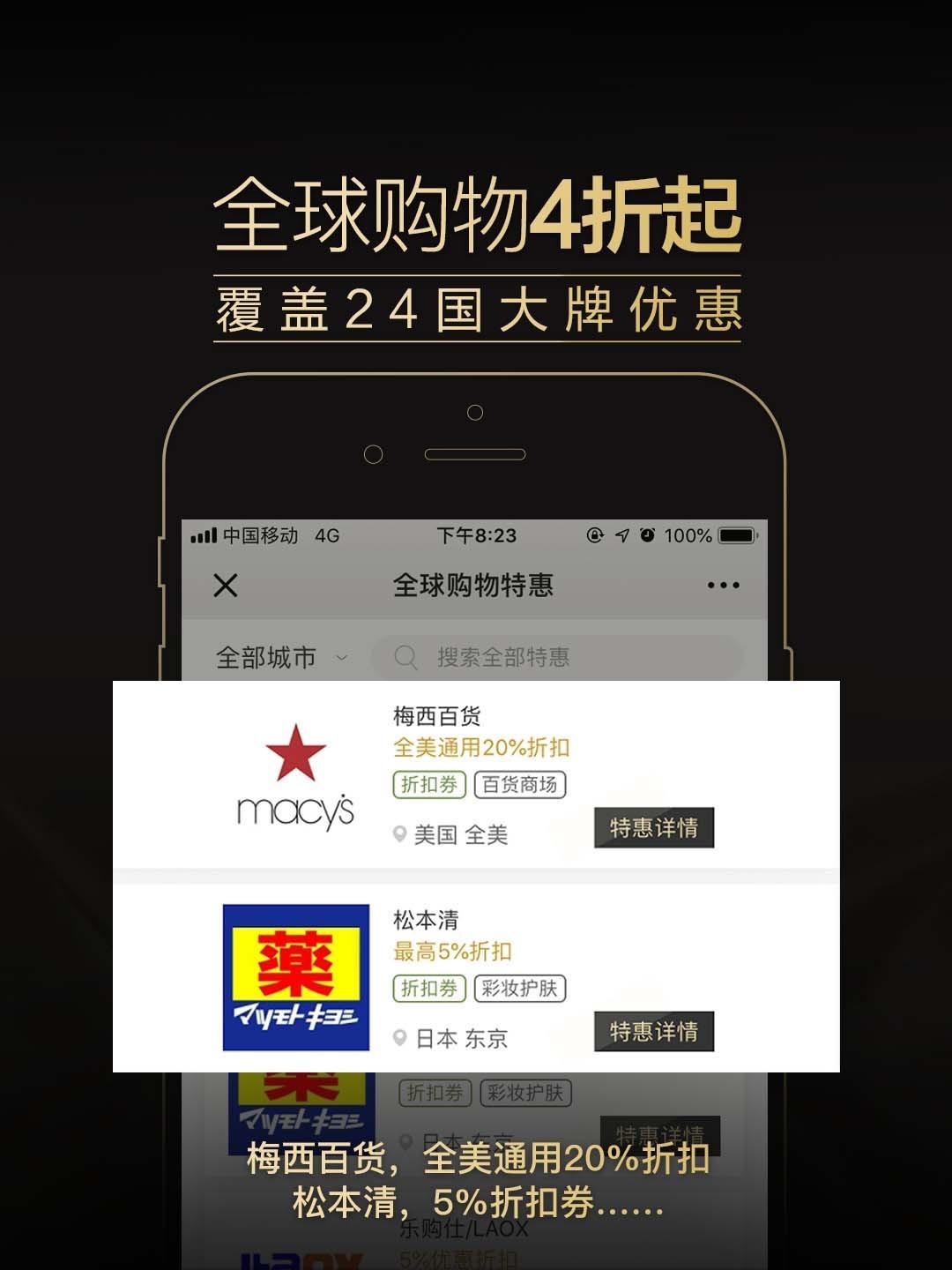 骑士商城与京东商城等电商平台合作,为用户甄选电商平台商品并提供骑士会员专享的促销活动价,限时5折起。全球购物优惠依托境外游的消费场景进行拓展,包括出行、住宿、购物、玩乐、饮食、以及增值服务等,覆盖全球24个国家160多个城市大牌优惠,其中包括了免税店及奥特莱斯等[3]