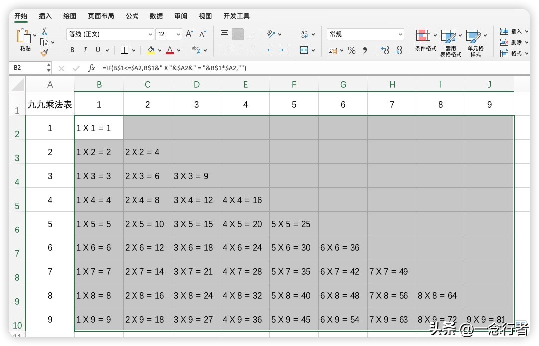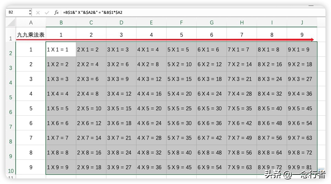 九行九列总共有81个单元格,自然不可能每个单元格都这样手工写公式,那与用二进制写程序有什么区别?