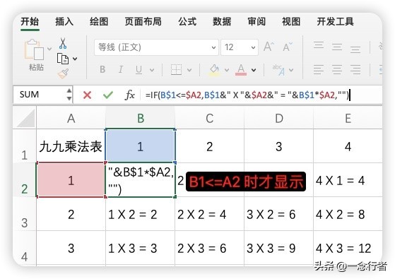 注意观察行列变化与公式显示的特点,会发现一个规律,以B2单元格的公式为例,如果B1<=A2,那么显示乘法口诀,否则显示为空白。