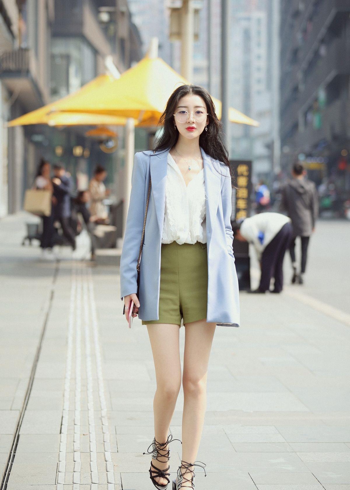高腰短裤+白色V领衬衣,一件蓝色小西装,时髦度up