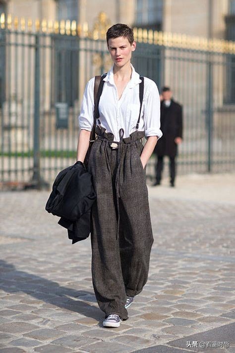 这种男生风格的穿搭很适合超级短发的女生,有种假小子的感觉,基本款的裤子和衬衫就可以,当然你也可以选择剪裁也别一点的款式。如果你担心太过中性,那么可以使用上面我提到的小饰品,比如发带,来消除减弱这种隐形。还有一种办法就是在面料上做文章,选择真丝或者垂坠感好一些,更女性化的面料,用这种方法来寻找一种平衡,其实穿搭本身就是一直在找平衡。或许有人质疑,这么折腾,那干嘛还要把头发剪那么短?但风格往往就是靠不一样的细节来成就的。