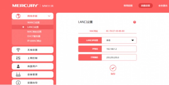 第三步,LAN口设置,把当前这个副路由器的IP地址更改成主路由器网关同一网段但不同于主路由器网关的地址,假设主路由器的网关地址为192.168.1.1,我们就可以把副路由器IP地址设为192.168.1.2,保存进入下一步。