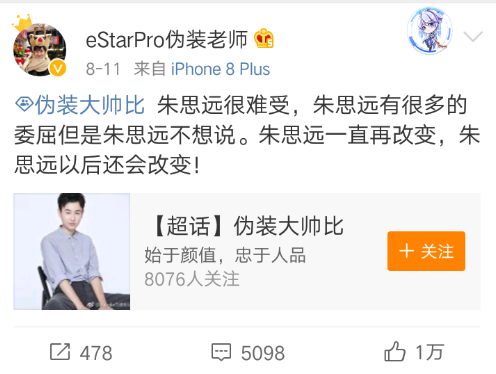 同时伪装也表示,像Cat拿了那么多冠军,就是为了证明自己,而他自己也不是没努力过,cat被喷子怼哭过,而他也一样,他的伤比Cat更重,但他却没能拿到冠军。