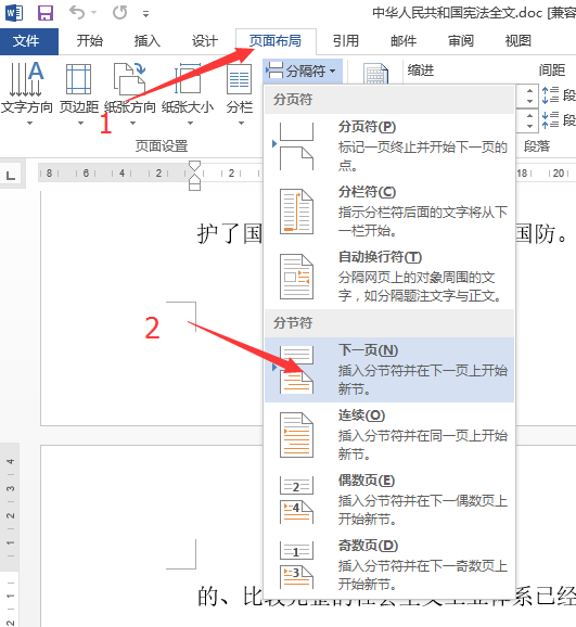 第二步:选择菜单栏中的“页面布局”选项卡,在“页面设置”组中点击“分页符”按钮,在弹出菜单中选择“下一页”