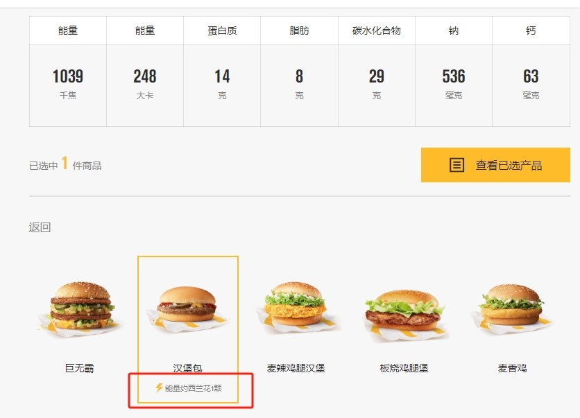 以汉堡类食物为例,热量最低的商品是“汉堡包”,也就是售卖商品中的最基础版经典汉堡,为248大卡,官网标注“能量约为西兰花一颗”。热量最高的是“巨无霸汉堡”,热量524大卡,标注为“能量约为牛油果2个”。除单项食品外,还提供了“500大卡套餐”选择,5种套餐搭配,热量均低于500大卡。