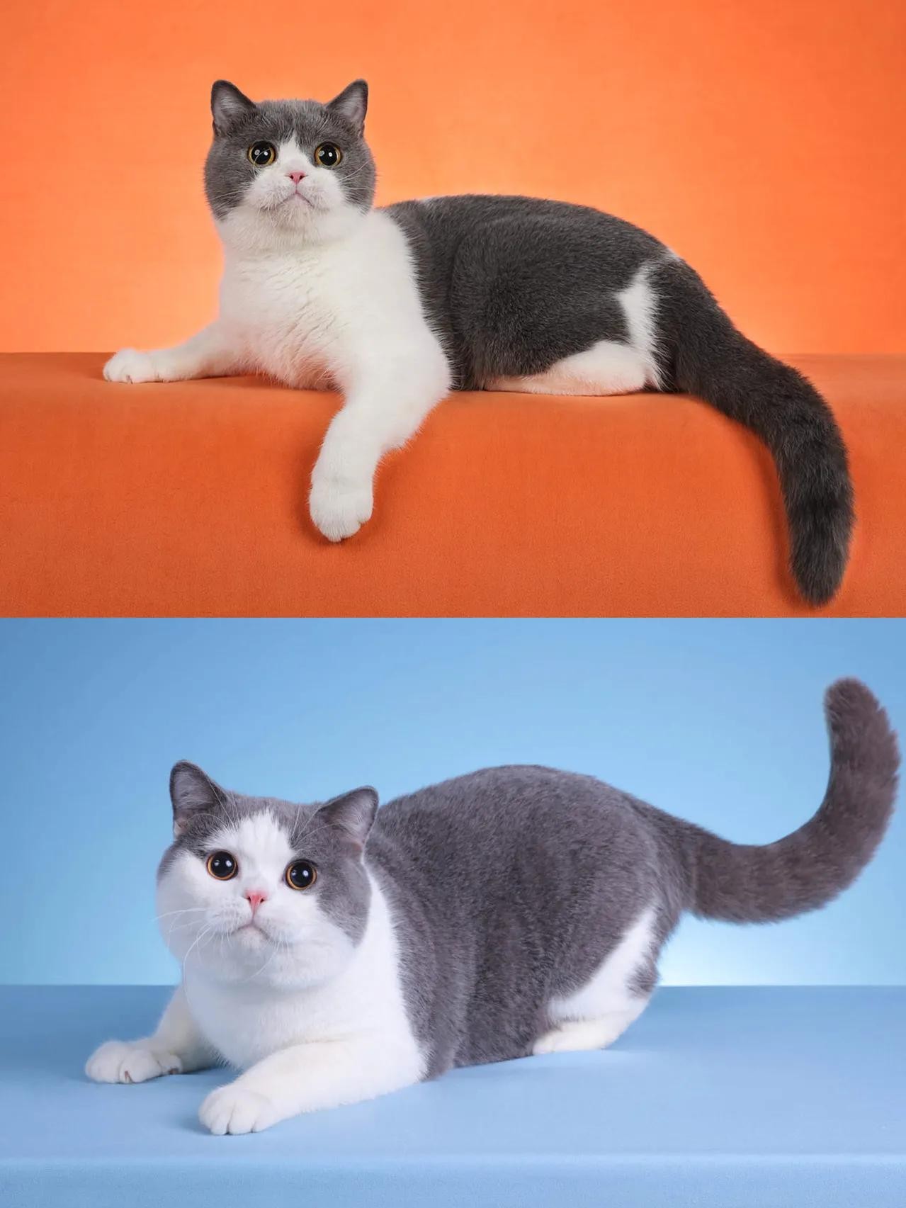 2⃣️蓝白双色:蓝白是蓝色和白色混色的,蓝白色一般脸颊通常会呈现“正八字”形状。鼻子嘴巴部位都是白色的,背上有蓝色,腹部是白色,一般眼睛都是金色橘色。