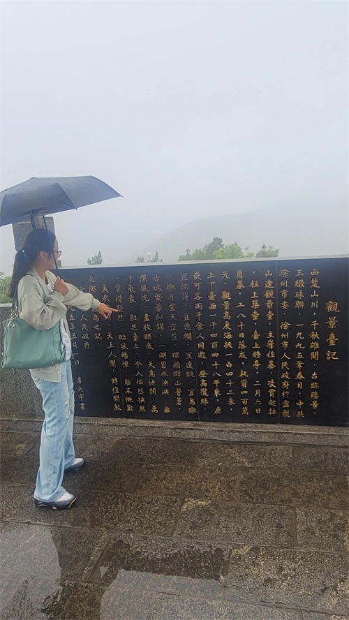 我在观景台上,看到徐州市政府立有石碑,把观景台修建的事迹写成短文,摘抄其中一段:“宜徜徉、宜凭栏、宜远眺、宜鸟瞰,极目云天茫茫,环顾群山苍苍,古城繁华似锦,一湖碧水泱泱。无限风光,尽收眼底,天高地阔,万千气象。”虽然仓促登山,但云龙山给我的印象很深刻。
