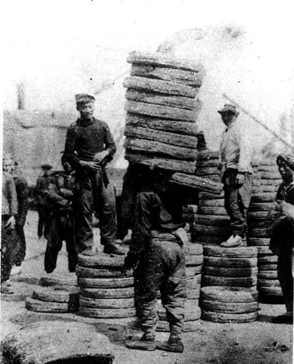 在日本殖民统治期间,大连港的吞吐量最高时达1000多万吨,当时机械化装卸设备很少,装卸作业主要靠人挑肩扛。在繁忙季节,大连港每天需要出动一万多人,平均每人每天要搬运10吨以上的货物。什么货物都得人扛,有粮食、豆饼、矿石、钢铁、炮弹等,甚至还有运回本土的日本人的尸体。豆饼每片重约23公斤,每人每次得扛4到6片,劳动量非常大。