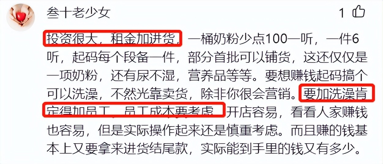 有网友评论到:成本很高,别盲目。房租+进货是大头,除了铺上奶粉、纸尿裤、营养品这些高价货以外,还要加上服务项目,比如游泳,那就需要再加上人工费用。就算凑齐了钱,把店开起来了,但是开店容易,赚钱很难。不要盲目进。