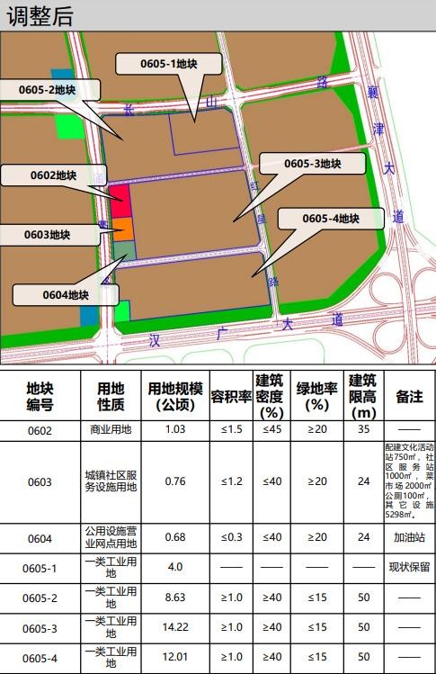 2、将0602、0603和0604地块调整为一类工业用地,并与0605整合后拆分为0605-1、0605-2、0605-3和0605-4地块,用地性质均为一类工业用地。其中0605-1地块建设用地面积为4.0公顷,已出让;0605-2地块建设用地面积为8.63公顷;0605-3地块建设用地面积为14.22公顷;0605-4地块建设用地面积为12.01公顷;0605-1、0605-2、0605-3和0605-4地块其他指标均与原0605地块指标保持一致。