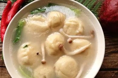 5、锅中倒适量水烧开,把做好的糯米团放入水中,中小火煮8分钟左右关火,一碗好吃的落水包就做好了,吃的时候放点猪油在上面,也可以烫一点蘑菇和青菜在碗里点缀一下哦。