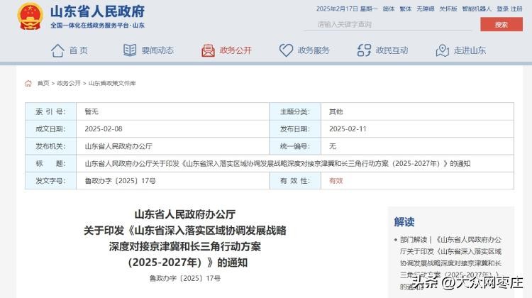 近日,山东省人民政府办公厅印发《山东省深入落实区域协调发展战略深度对接京津冀和长三角行动方案(2025-2027年)》。方案提到——