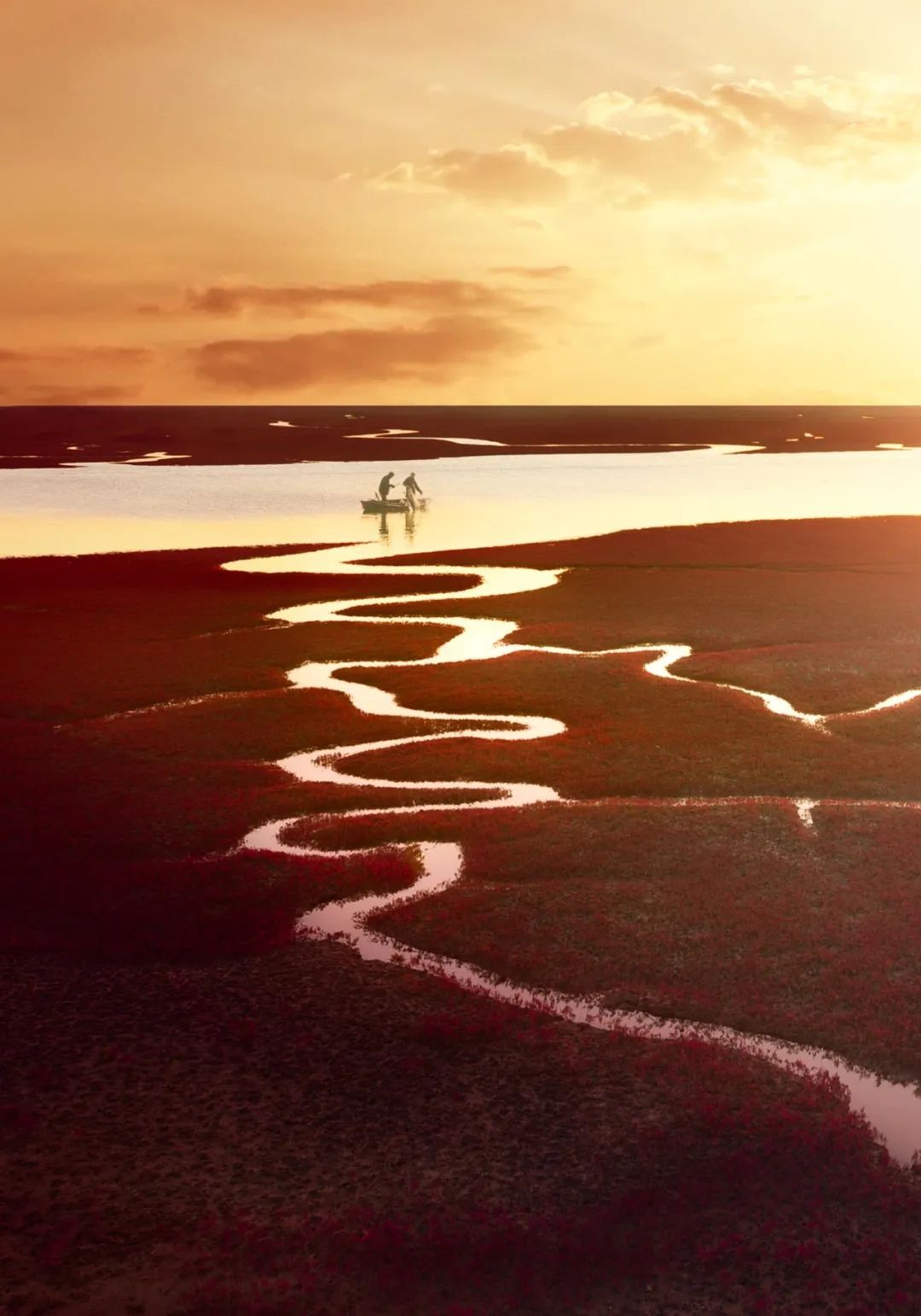 湖边草甸华丽变身为连片抢眼的红草滩,