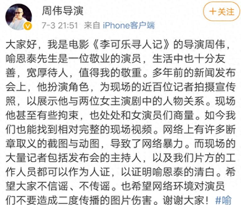 事件的女主角发表了一篇长文,她勇敢地站出来,让世界知道如果女性在职场遭遇了骚扰,一定要勇敢地站出来。她的这一番话,证实了喻恩泰的行为确实有些不当。