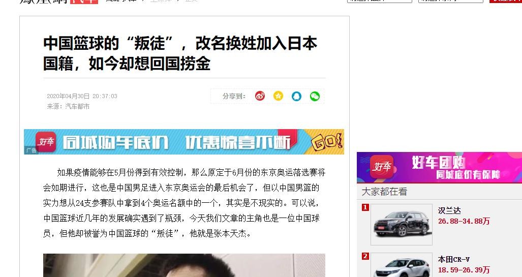 凤凰网 2020年04月30日《中国篮球的“叛徒”,改名换姓加入日本国籍,如今却想回国捞金》