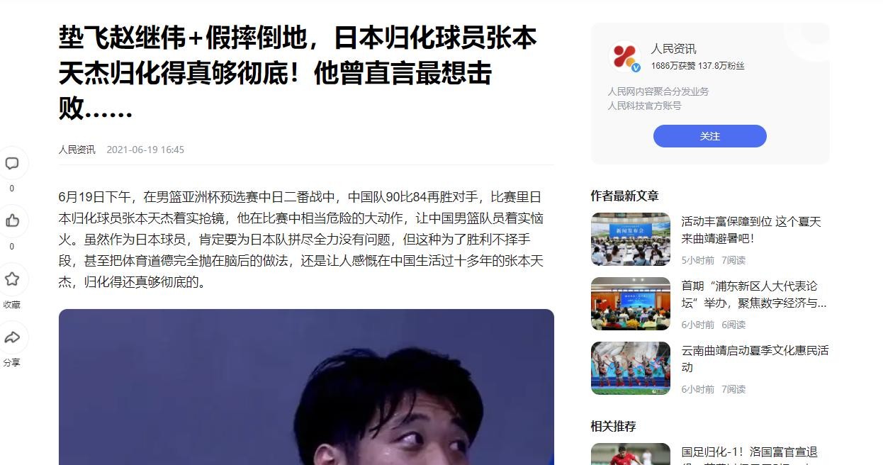 6-19《垫飞赵继伟+假摔倒地,日本归化球员张本天杰归化得真够彻底!他曾直言最想击败……》