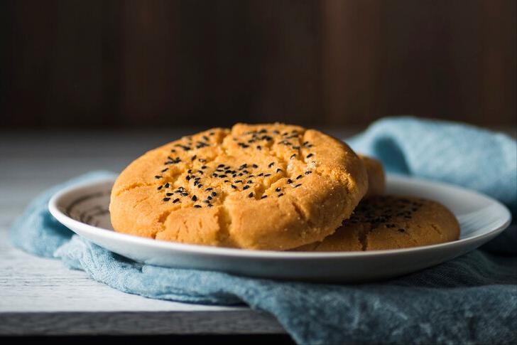 在烤盘上铺张油纸,把压好的面团放上去,用大拇指在中间按个小坑,然后撒上点黑芝麻。这样不仅好看,吃起来口感也更有层次呢!