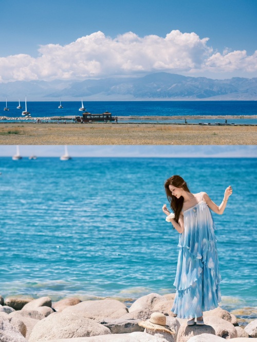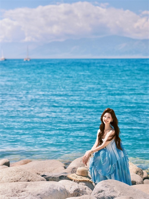 在大场景的机位下,可以将模特置于画面的右下角,尝试蹲下来,双手自然垂放,让姿势帮助模特融入周围的环境,同时也能展示出一种放松的状态,摄影师可以选择从高角度拍摄,这样不仅能够捕捉到模特的全貌,还能将更多的风景收入镜头之中。