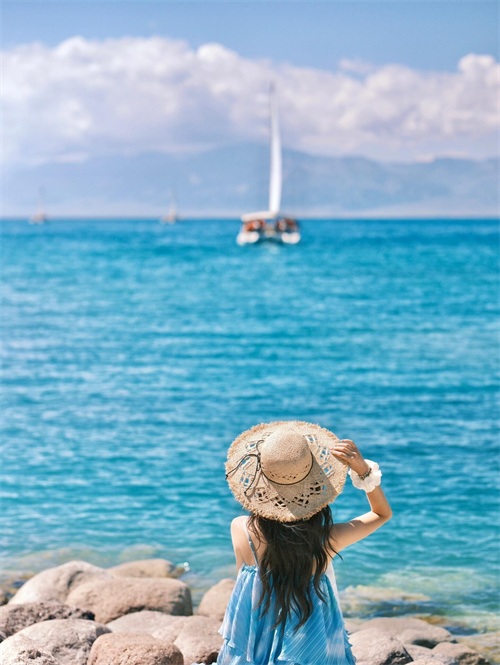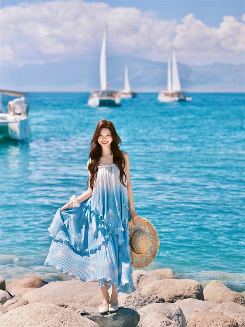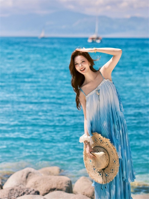 如果是穿着裙子拍照,我们可以一手提裙摆,另外一手拿帽子,这样的姿势一来能够展现出裙摆的飘逸感,二来也能增加画面的层次感,尤其是在微风轻拂的时候,这种动作会显得格外优雅,随手一拍都好看。