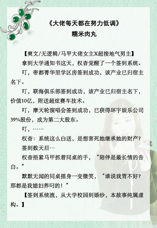 系统送的东西都非常大手笔,虽然走的正规途径,女主不会被抓,但她不会刻意炫富打脸他人,而是战战兢兢捂紧小马甲,每天都在努力低调,后面会慢慢的从青涩懵懂蜕变成稳重淡然,还收获了属于自己的爱情。男主是女主的同桌,家世背景非常厉害,没啥架子,很接地气哦。