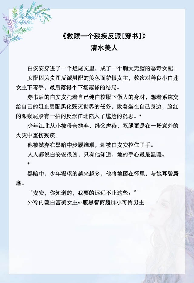 短评:治愈系小甜饼,校园文,穿书现言,系统,男主腿部截肢。原主家是b市首富,有权有势,又因为她是家中独女,父母疼她疼得不要不要的,使得原主变得嚣张跋扈又头脑简单。在原书中,她折腾原女主,觊觎反派男配,最终被烦不胜烦的反派弄死。女主穿越在反派刚残疾不久,她的任务就是阻止男主黑化灭世,引导他走上正路,事成后即可回到现实世界。