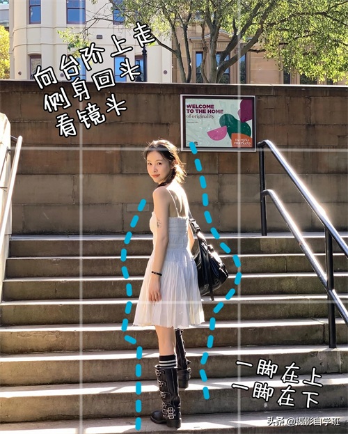 当你站在台阶上时,可以尝试一脚在上、一脚在下的姿势。侧身回头看向镜头,这样的动作不仅显得优雅,还能拉长腿部线条,让身材更加修长。摄影师可以从稍低的角度拍摄,以突出你的身材优势。